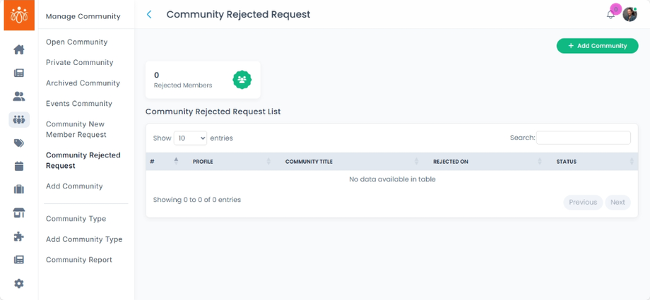 Navigate to Community Rejected Requests under the Community menu to see a list of users whose join requests have been denied. -