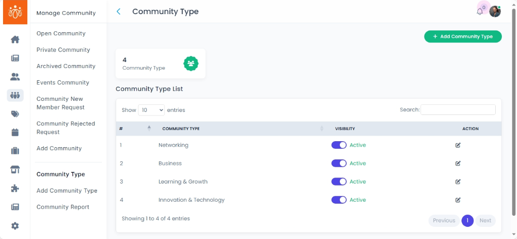 The Community Type section enables administrators to view, organize, and create categories (tags) that classify different communities within the platform. Properly tagging communities helps streamline navigation, improve content relevance, and facilitate targeted engagement.