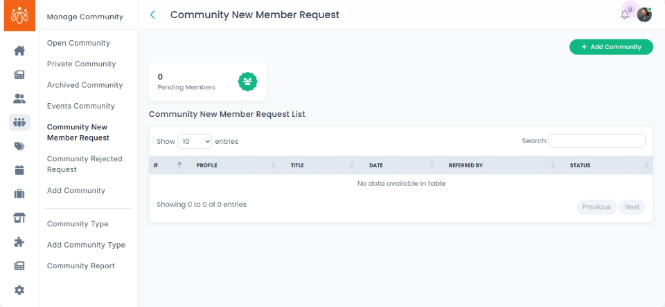 The Community New Member Request section displays all pending requests from users wishing to join specific communities. Each request contains the member’s name, the community they want to join, and any message they included with their request. Administrators can review these requests and decide whether to approve or reject them.