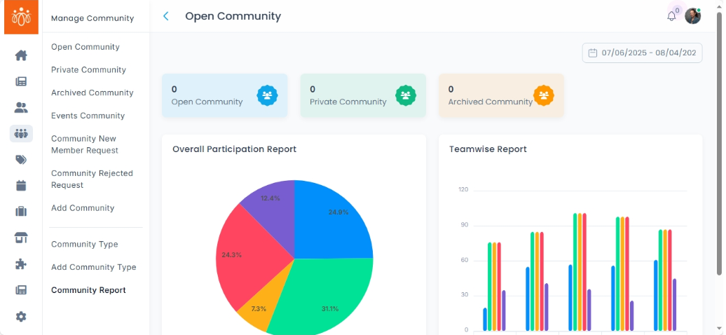 The Community Report section provides detailed metrics for each community, including member counts, posts, polls, and overall engagement levels. These insights help administrators analyze community activity, track growth trends, and make informed decisions to improve community management and participation.