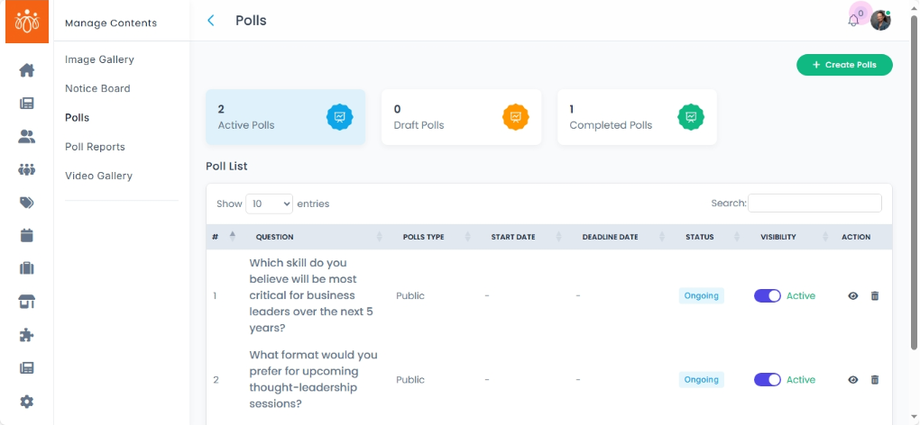 The Polls section allows admins to create, manage, and track polls for collecting feedback, opinions, or votes from members. Polls can be public (visible to all) or community-based (restricted to specific groups). Admins can view Active, Draft, and Completed polls in separate tabs for easier organization.