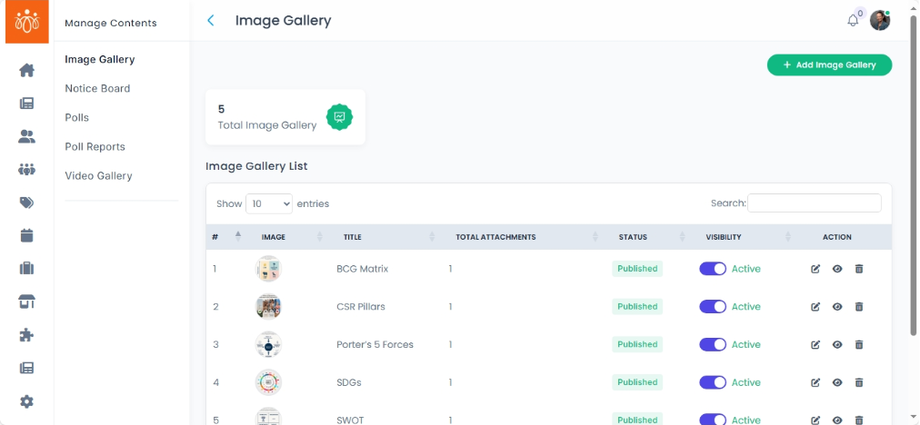 The Image Gallery section stores all images uploaded to the platform. Each image can have a title, description. This feature is useful for event highlights, promotional material, and community-specific visual content.