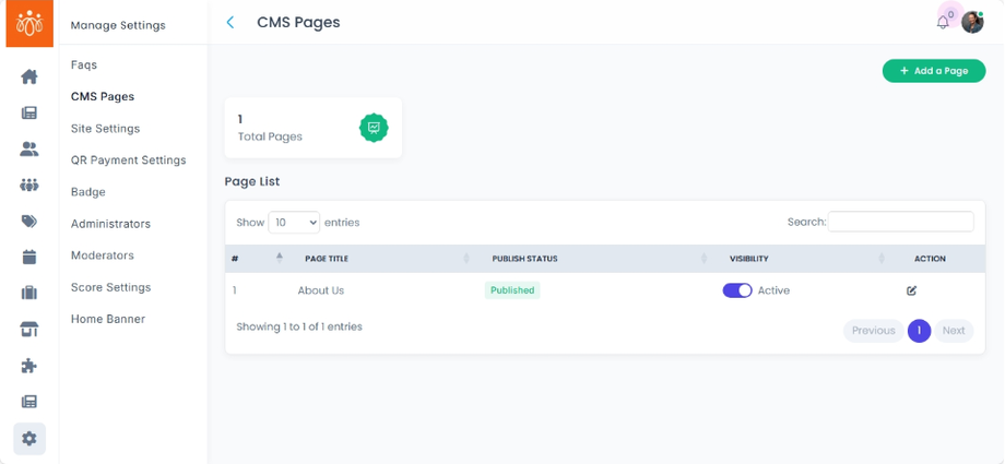 The CMS Page section allows admins to create and manage informational pages within the platform, such as About Us, Terms & Conditions, Privacy Policy, and other custom content pages.