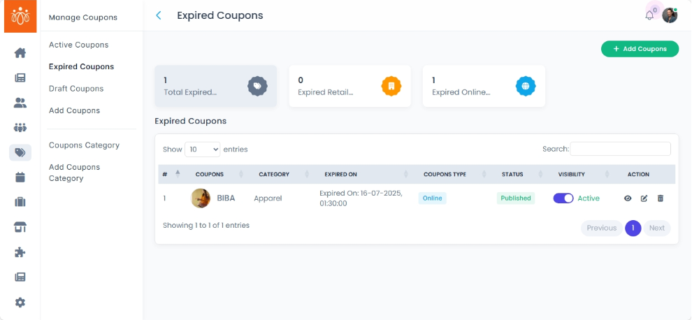 The Expired Coupons section lists all coupons that are no longer valid because their set validity period has ended. This section allows admins to review coupons or clean up old records that are no longer needed.