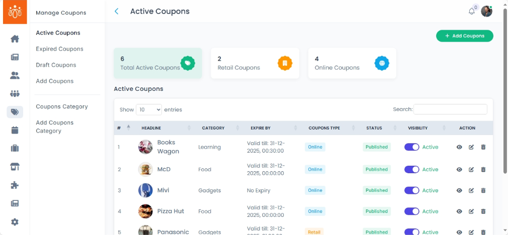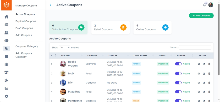 The Active Coupons section lists all coupon codes that are currently valid and can be redeemed by members. This view helps admins monitor ongoing promotions, track usage, and ensure that all active coupons are functioning as intended.
