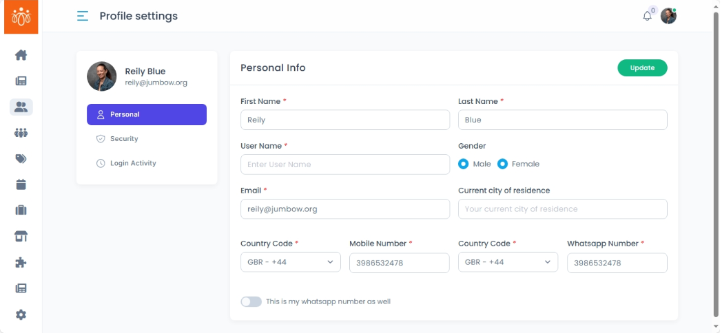 After editing any profile fields, click Update to confirm updates.