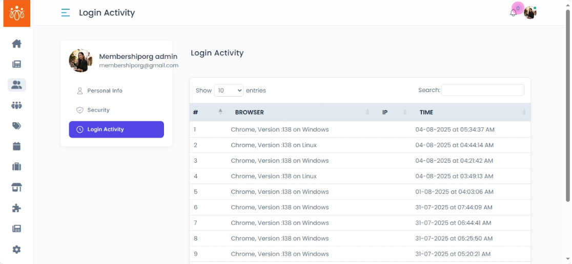 The Login Activity section provides a detailed log of all login attempts made to your admin account. Each record includes the masked IP address, device information, and timestamp, helping admins track account access and identify any unusual or unauthorized activity.