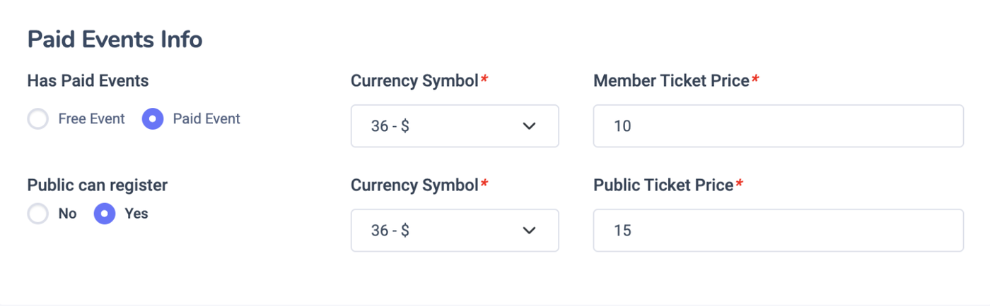 When setting up an event, you have the option to configure it as a paid event. This allows you to collect ticket fees from both members and the public, and set different prices and currency options for each audience.