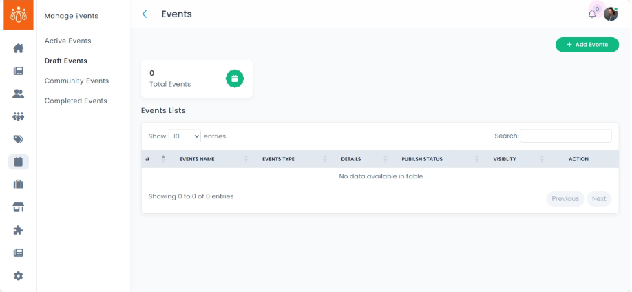 The Draft Events section contains all event entries that have been saved but not yet published. This allows administrators to prepare event details in advance, collaborate on content, and finalize information before making events public.