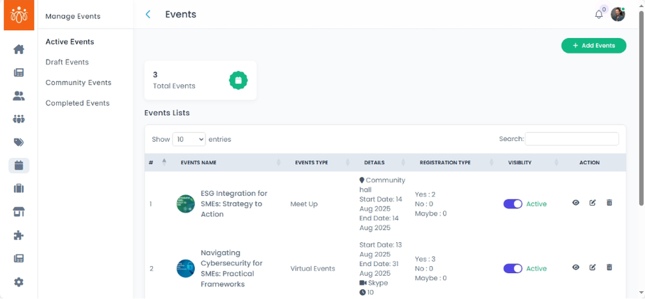 The Active Events section displays all live and upcoming events on the platform. This feature enables administrators to monitor ongoing event details, manage participants, and make timely updates or changes as needed.