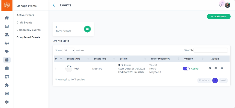 The Completed Events section lists all past events along with key metrics such as attendance statistics and feedback (if feedback collection is enabled). This feature allows administrators to review event performance and participant engagement to inform future planning.