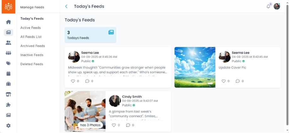 The Today’s Feeds section displays all posts that have been posted by the members on the platform within the current day. Admins can review and manage these feeds in real time, ensuring that all published content meets community guidelines and engagement goals.