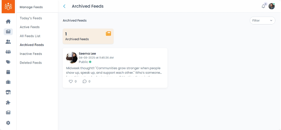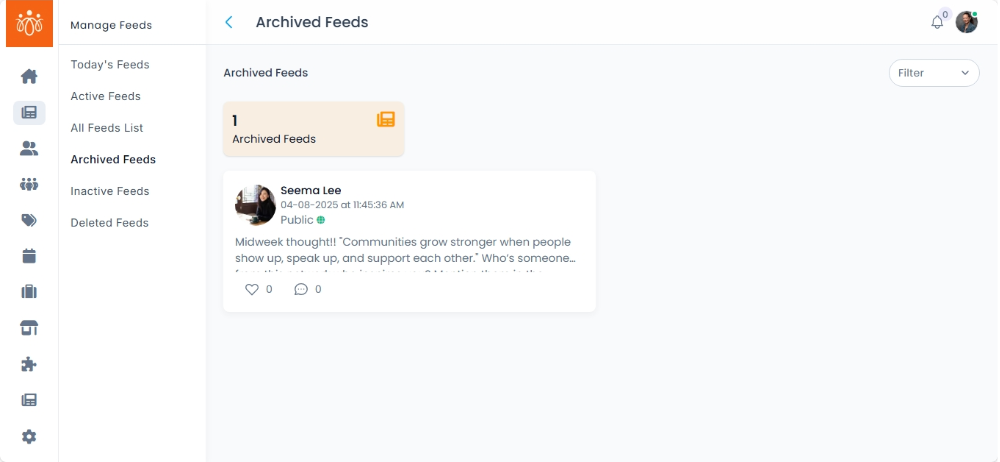 The Archived Feeds section stores posts that have been archived from public view but are still retained in the system for future reference, compliance, or potential reuse. Archiving allows you to keep historical content without displaying it in the active feed.