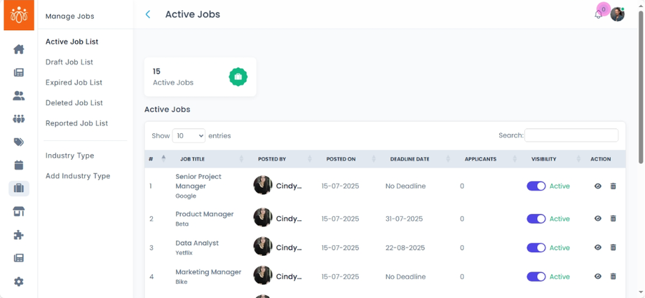 The Active Job List displays all job postings that are currently published and visible to job seekers. This section allows administrators to view, manage visibility or delete active job listings efficiently, ensuring the job board remains current and relevant