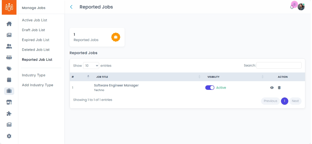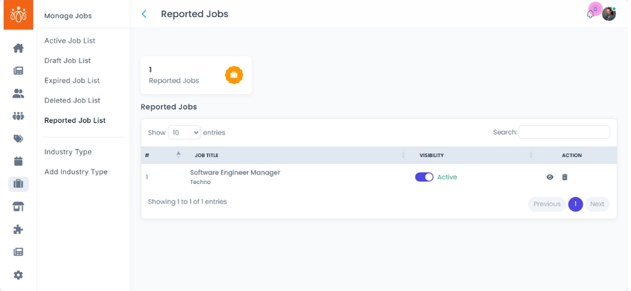 Navigate to Reported Job List under the Jobs menu to view all flagged job posts. -