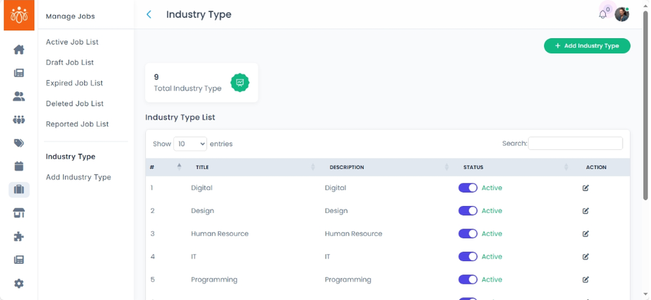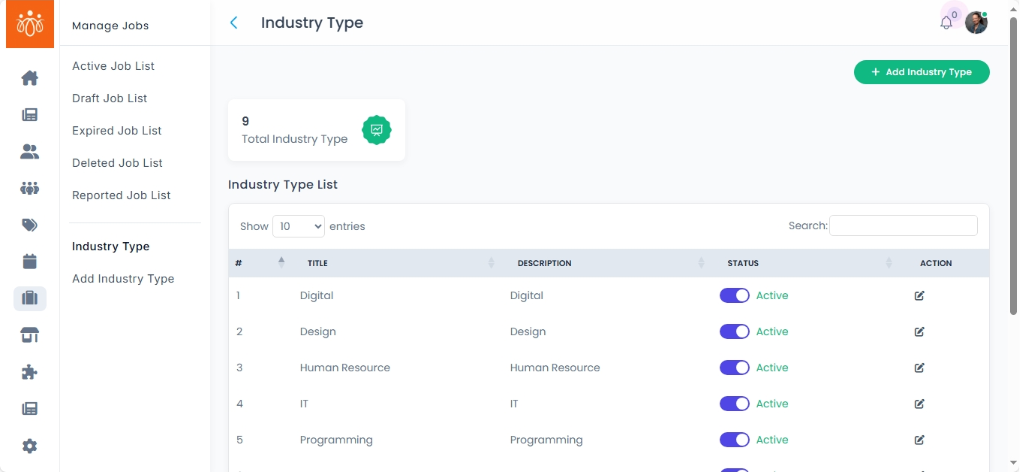 Navigate to Industry Type under the Jobs menu to see the list of all job categories.