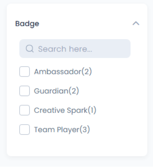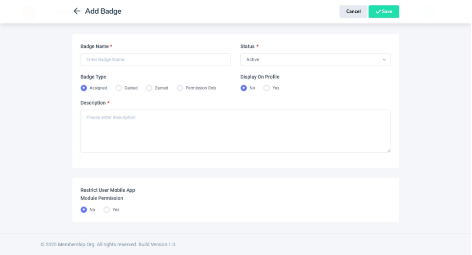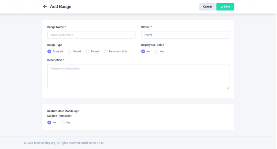 The Badges section allows admins to manage recognition and achievement markers for members. Badges can be used to highlight member status, accomplishments, participation levels, or special roles within the platform. Each badge has a name, icon, and description that explains its purpose.