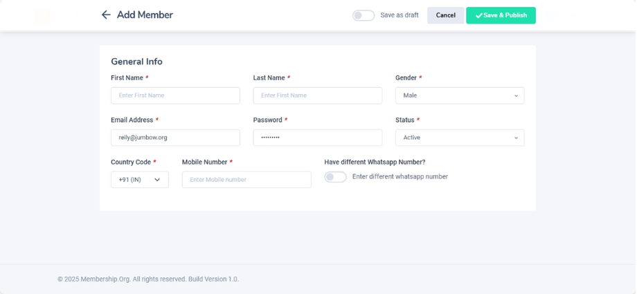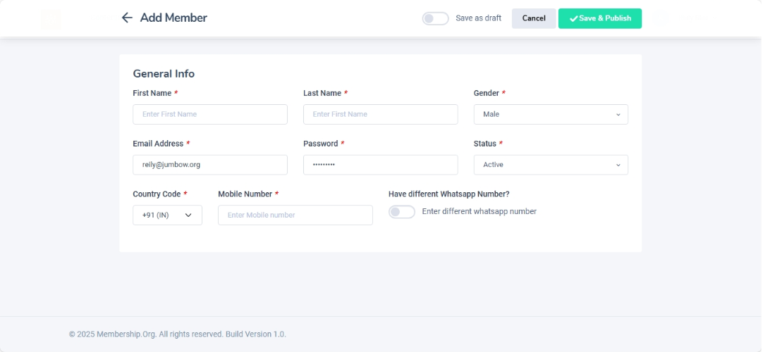WhatsApp Contact – Add the member’s WhatsApp number if different from their mobile number. This can be used for direct communication or automated alerts.