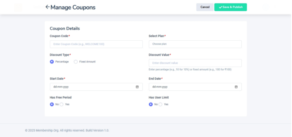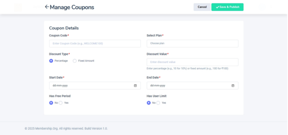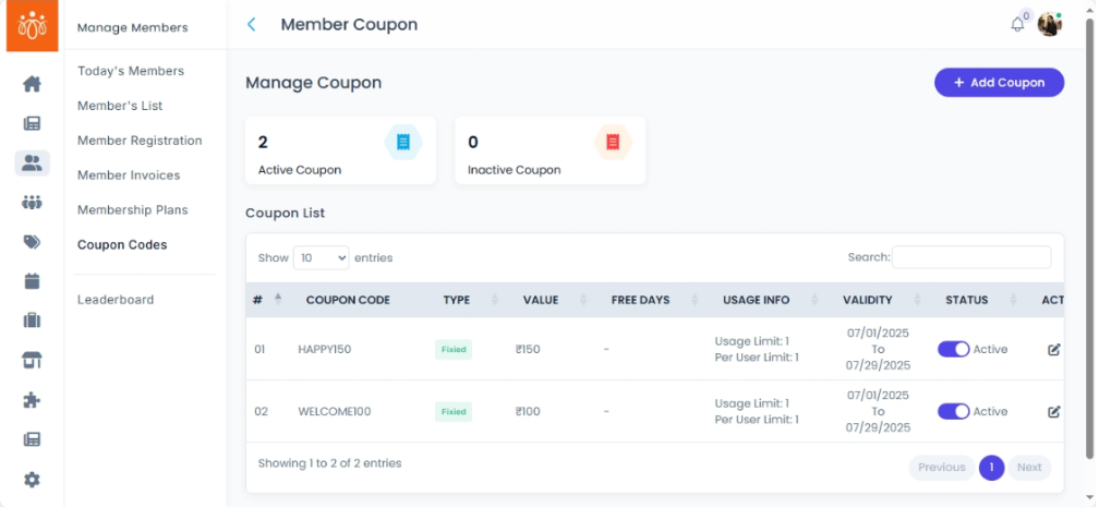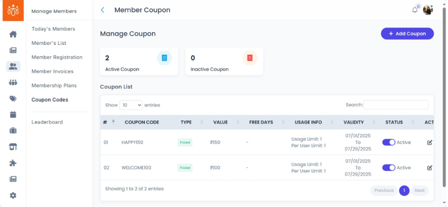 The Coupon Codes section allows admins to create and manage promotional codes for membership plans. Coupons can be used to offer fixed-amount discounts or percentage-based reductions, helping attract new members, reward loyalty, or support special campaigns.