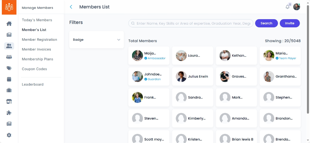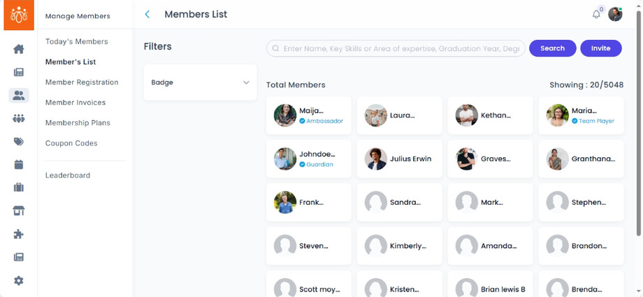 • Filtering members based on criteria such as badge, or name.