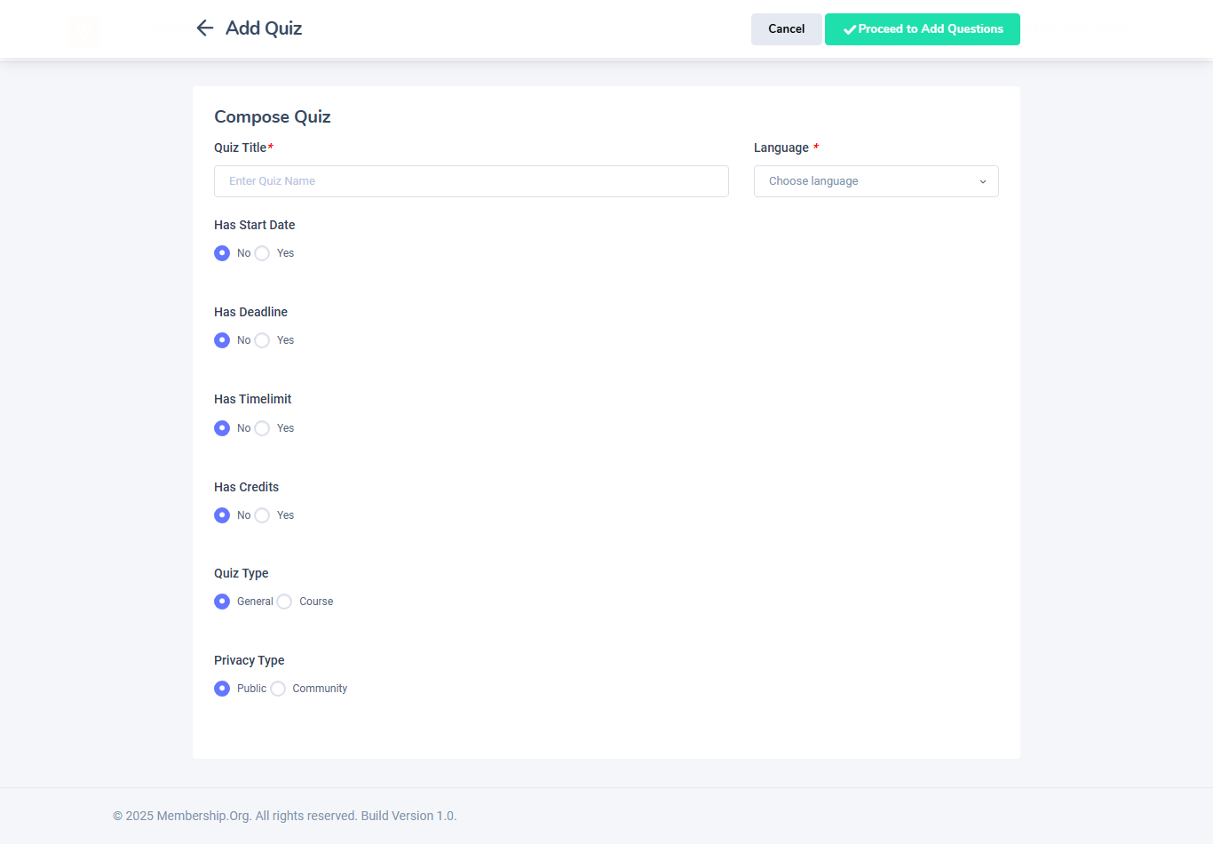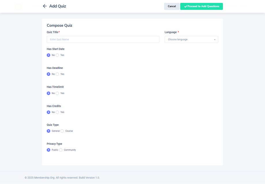 • Quiz Type: Choose between General Quiz or Course Quiz (if linked to learning modules).