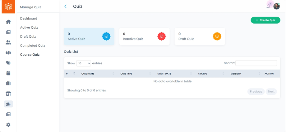 • Navigate to Quiz → Course Quiz to see all quizzes tied to courses or training modules.