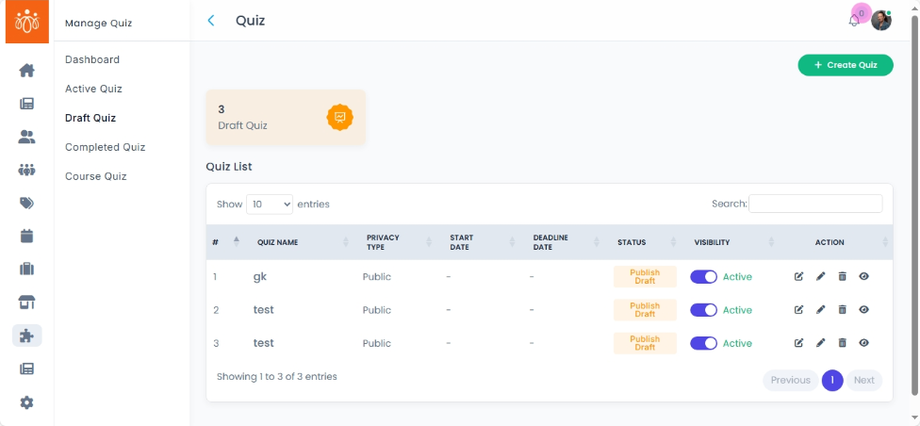 The Draft Quiz section contains all quizzes that have been created but not yet published. These are works-in-progress that can be edited, reviewed, and finalized before going live to members. Drafts are useful when you want to prepare quiz content in advance without making it immediately available.