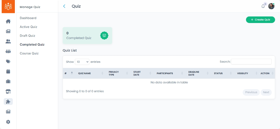 The Completed Quiz section displays all quizzes that have reached their deadline dates . It provides detailed performance metrics, allowing admins to review individual and group results, analyse answer patterns, and assess overall engagement. This section is essential for tracking knowledge retention, evaluating training effectiveness, or running competitions.