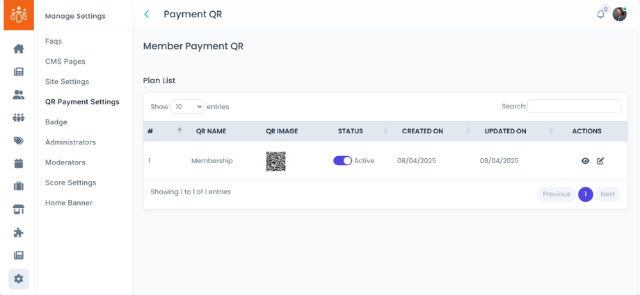 The QR Payment Settings section allows admins to upload the organization’s official UPI QR code for collecting payments related to membership registrations, renewals, or other paid services. Once uploaded, this QR code is automatically displayed on the frontend in all payment-enabled areas of the platform, ensuring a smooth and consistent payment process for members.